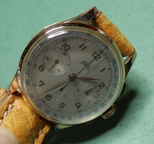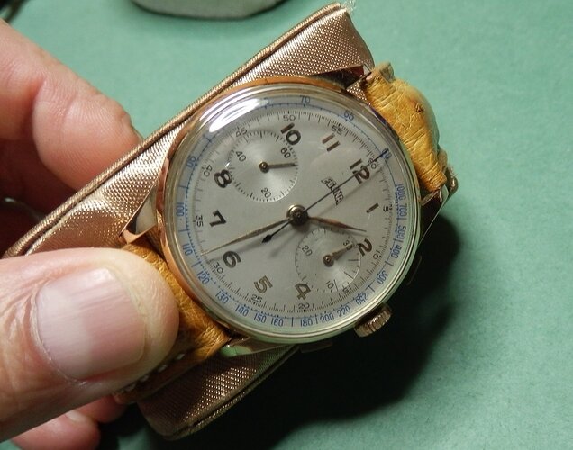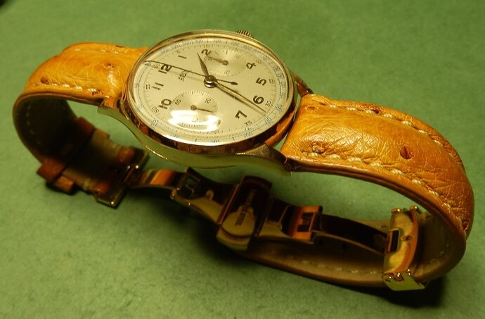 Zit ik alleen nog met de vraag wat voor uurwerk het is. Volgens Ranfft kom ik uit op een FHF, maar ik heb er nog geen gevonden met een date pointer. Staat ook geen merkje of nummer op de achterkan van het uurwerk. Iemand een idee?