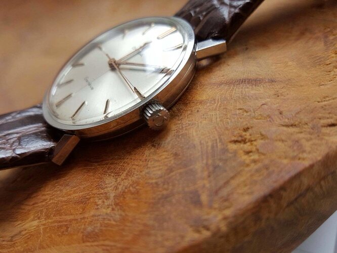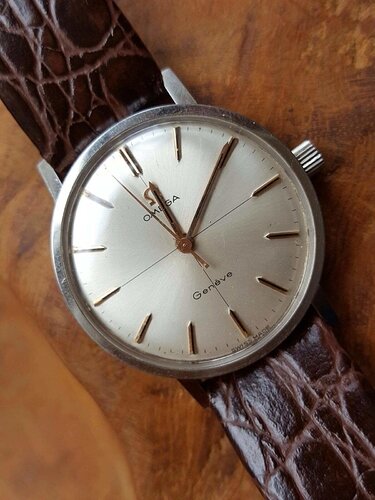 Het betreft een Omega 131.019, gemaakt ergens in de jaren 60. Het is een stalen handopwinder. Hij is erg licht in verhouding tot mijn andere horloges en er zit een lederen band op.