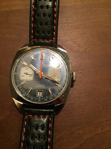Hij heeft wat tekenen van zijn leeftijd, zo heeft de chronowijzer nog maar de helft van zijn verf, zijn de uren- en minutenwijzer ook mooi verkleur en brokkelt de lume wat af, maar dit zijn dingen waardoor ik hem misschien zelfs nog mooier vind. Hij heeft karakter, zonder dat het té is in mijn ogen.