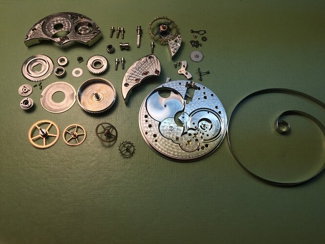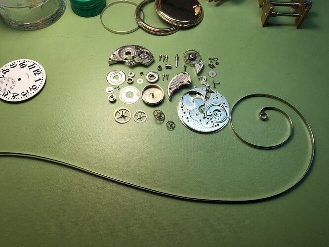 Alle onderdelen klaar voor montage, wat opvalt is hoe groot en lang de veer is, deze gigantisch in vergelijking met een andere veer voor een dergelijk formaat zakhorloge.