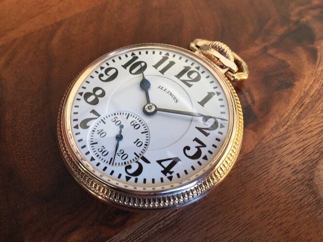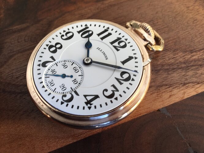Afgelopen rikketik viel mijn oog op een vitrine met zakhorloges, met daarachter twee redelijk jonge jongens uit Frankrijk, waarvan een horlogemaker bij een exclusieve juwelierszaak in Frankrijk (met name Rolex, Omega JLC, etc). Mijn oog werd getrokken door een horloge in de vitrine, een horloge met dikke wijzers en dikke cijfers op de wijzerplaat. Onmiskenbaar een spoorwegzakhorloge. De naam Illinois prijkte op de wijzerplaat. Ik vroeg of ik het horloge een mocht zien en kreeg het in m' handen gedrukt. Na het achterdeksel verwijderd te hebben, zag ik direct dat het een 'Bunn special' was. Het uurwerkje zag een prima uit, de balans was niet gebroken en het horloge tikte nog een beetje, maar zou wel een onderhoudsbeurt nodig hebben. Toen ik vroeg hoeveel het horloge kostte, moest ik mijn enthousiasme even voor me houden. Ik mocht het horloge koper voor 40 euro, een schijntje voor zo'n horloge. Hij had blijkbaar geen idee wat voor bijzonder horloge en uurwerkje het was.