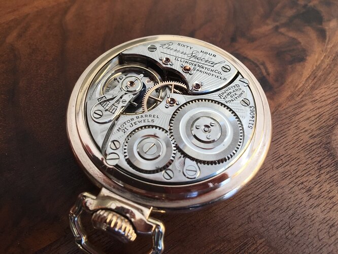 Het uurwerk is voorzien van een compensatiebalans, een breguet spiraalveer, 21 robijnen/saffieren lagertjes, waarvan de meeste zijn gezet in gouden chatons. Naast de balans, zijn ook het anker en het ankerrad voorzien van dekstenen, om onnauwkeurigheid door spelling te minimaliseren. Daarnaast is de complete tandwieltrein, met uitzondering van het ankerrad gemaakt van massief goud! De veer is extra lang en groot en het horloge heeft een gangreserve van 60 uur gecombineerd met een 'motor barrel', een wat ingewikkelde constructie van veerton en kroonrad, om de schade in geval van een gebroken veer te verminderen. Daarnaast is het uurwerk visueel ook aantrekkelijk, door een ingewikkeld 'damaskeening' patroon, aangebracht in de vernikkelde afwerking van de platines. De Amerikanen waren hier destijds zeer goed is, en hierdoor zijn Amerikaanse uurwerken uit die periode vaak zonder uitzondering prachtig bewerkt.