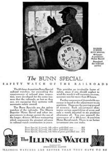 Tot zoverre de geschiednis van Illinois. Een van de directeurs van Illinois was de zekere heer John W. Bunn, waarnaar het model 'Bunn special werd vernoemd. Dit horloge werd op de markt gebracht als een spoorwegzakhorloge, een zeer hoogwaardig en precies horloge wat door een machinist of conducteur gedragen werd. In de geschiedenis zijn meerdere ongelukken gebeurd en tientalen doden gevallen, omdat treinen met volle vaart frontaal op elkaar botsten, omdat er tussen de stations in maar een spoor werd gebruikt. Als het horloge van de machinist of conducteur niet goed liep en enkele minuten afweek, konden twee treinen zomaar in tegengestelde richting op hetzelfde spoor komen. Daarom stelde juwelier Web C Ball strenge eisen op waaraan zakhorloges die gebruikt werden op de spoorwegen gebruikt werden. Deze spoorwegzakhorloges moesten aan strenge eisen voldoen, zowel qua technische specificaties van het uurwerk, als de opmaak van de wijzers en wijzerplaat. Zo moest een horloge altijd '16 size' zijn, arabische nummers op de wijzerplaat hebben, dikke wijzer, een uurwerk met minimaal 17 stenen, een hendeltje onder de bezem om de tijd te verzetten en een afwijking van maximaal 30 seconden per week. Deze spoorweghorloges uit de periode 1890-1940 kunnen gemakkelijk gerekend worden tot de beste horloges gemaakt die die periode, en misschien wel tot de dag van vandaag, en koste destijds een maandsalaris. Hieronder enkele advertenties uit die tijd, waarin werd 'gestreden' om het meest nauwkeurige en betrouwbare horloge.